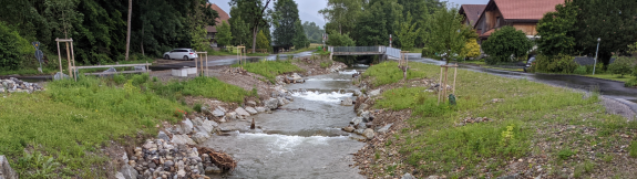 Les mesures d'assainissement ont dû être réalisées de manière anticipée sur un tronçon de 180 m, car les murs de berge étaient fortement sapés. Le pont de la route cantonale a été remplacé en simultané avec les travaux d’aménagement des eaux. Dans le tronçon en amont de la route cantonale, le chenal a été revitalisé. Dans le tronçon en aval de la route cantonale, des murs de berge ont été reconstruits en raison des contraintes d'espace. Des seuils en blocs ont été installés ponctuellement pour stabiliser le fond du lit.